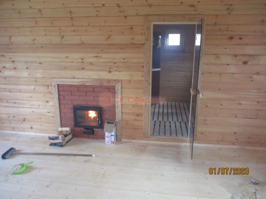 Установлена интересная чугунная конвекционная банная печь «Сибирь-18», которая в кирпичном окладе и с панорамным стеклом выглядит как настоящий камин.