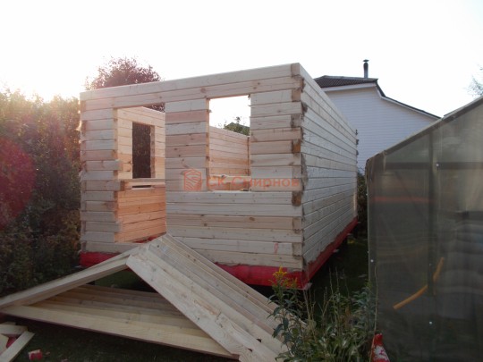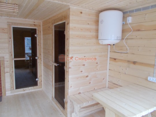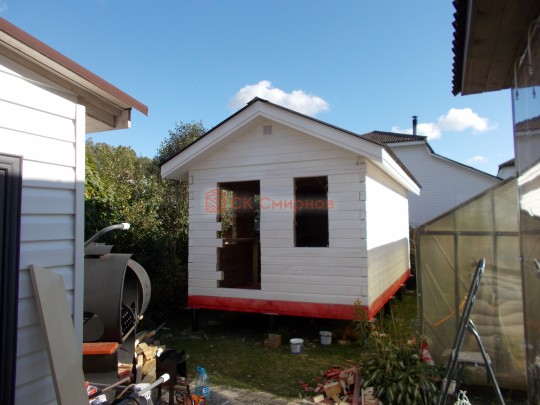 Баня на фотографии построена из сухого профилированного бруса камерной сушки