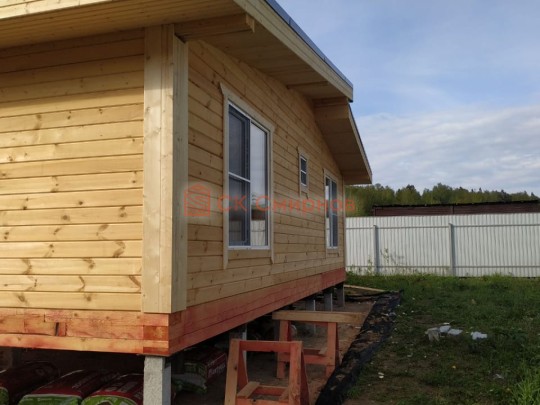 Из профилированного сухого бруса 9х14см, 14х14 см или 14х19 см. Сборка сруба в теплый угол на нагеля или гвозди 200 мм со сверлением отверстия в верхнем брусе (в зависимости от вида бруса).