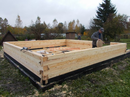 Из 9х14см, 14х14 см или 14х19 см. Сборка сруба в теплый угол на нагеля или гвозди 200 мм со сверлением отверстия в верхнем брусе (в зависимости от вида бруса).
