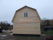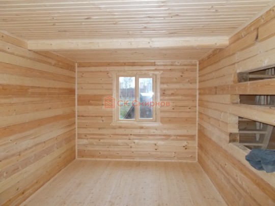 Из профилированного сухого бруса 9х14см, 14х14 см или 14х19 см. Сборка сруба в теплый угол на нагеля или гвозди 200 мм со сверлением отверстия в верхнем брусе (в зависимости от вида бруса).