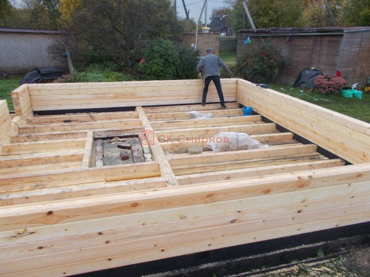 Лаги, обвязку и черновой пол обрабатываем раствором био огне защитой ( зимой оговариваются отдельные условия ), в основном красный цвет, но может быть и бесцветная обработка.