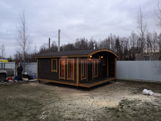 Бани подобного типа мы строим как по каркасной технологии с утеплением и обшивкой доской внахлёст, так и из клееного или сухого бруса. В обоих случаях качество сборки превосходное: баня тёплая, надёжная и очень красивая.