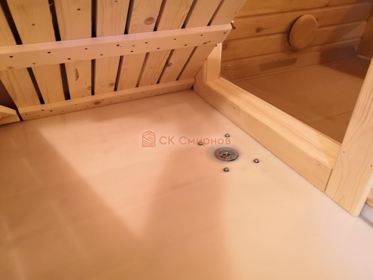 В комнате для приема душевых процедур на полу устанавливается душевой пластиковый поддон который имеет слив на улицу. В поддоне лежит деревянный трапик для удобства.