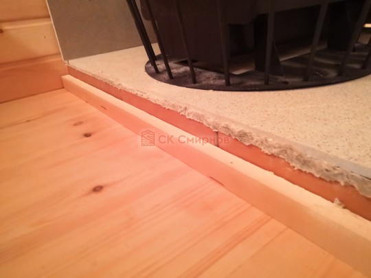 На полу укладывается доска половая толщиной 28мм, крепится саморезами в потай.