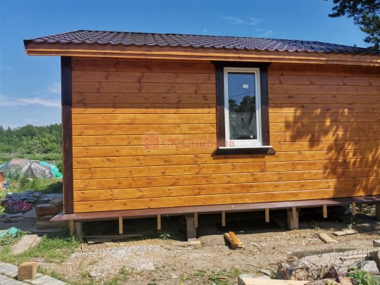 Это одноэтажная дача 6 на 6 с нежилым чердаком (лестницы нет). Пространство внутри разделено на 3 помещения. В основе лежит брусовой каркас, который снаружи обшит имитацией бруса 20х190, а изнутри сортовой вагонкой. Двускатная крыша покрыта хорошей металлочерепицей GrandLine с полимерным напылением. Изначально ставили деревянные стеклопакеты, но в ходе строительства клиент поменял решение и привёз свои пластиковые окна. Входная дверь Аргус 9.